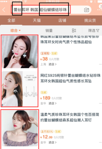那要是我们的店铺的曝光词很多,但是买家没有点击呢?这个时候我们就需要仔细分析了。举个例子,比如:蕾丝耳环 韩国 超仙蝴蝶结珍珠。