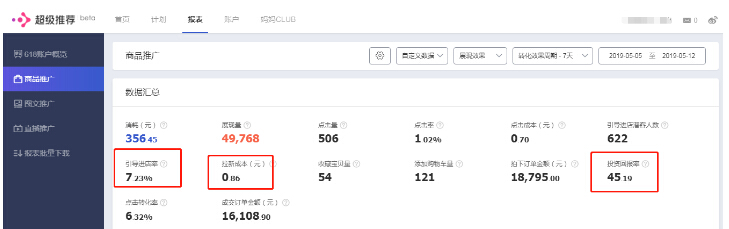 超级推荐不同于直通车,点击率前期不要过于重视,着重放在点击成本和拉新成本上,先把这两项指标降下来,降低了点击成本投资回报率也会相应的得到提升,超级推荐成本低,可以作为一个提高投产的工具。