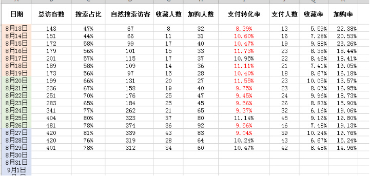 那怎么做呢?肯定不仅仅是把这些关键词添加到标题里面就可以了,还需要接下来一系列的操作,比如收藏、加购、转化率,这些数据都会影响宝贝的权重。而当你的这些数据指标都提升了之后,你的关键词权重也会提升。下图是做的数据记录