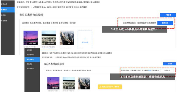 其实具体的操作还是非常简单的,只不过没有收到邀请的商家是没有资格设置的,并且想要主图洋淘秀显示的话还需要三条被官方收录的内容才会出现“合成视频”的按钮,才有机会被展示哦。