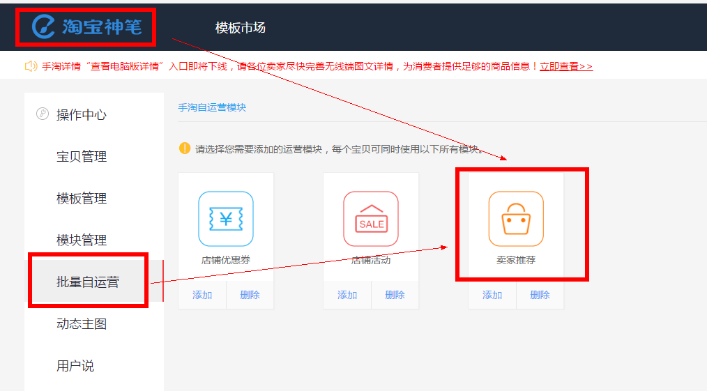 要做的是店铺整体关联网,什么意思,详情页一定要把之前有销量和流量的宝贝关联推荐,增加顾客的浏览深度,一个宝贝满足不了一个顾客,如果多个不同款式的宝贝放在一起,总有一款能满足她,我们要做的是最大化我们的访客浏览量,从而促进转化。位置在淘宝神笔,批量自运营里面的卖家推荐。每个宝贝底下能关联三款宝贝,我们只需要在引流款下方推荐主推款和利润款。