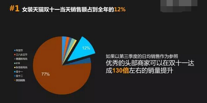 近几年女装双11平均销售额可以占到全年销售的12%,这个水平基本上是双12的4倍,618的5倍,新风尚的5倍。优秀的商家双11当天的业绩,如果以第三季度的人均销售额为基准,可以达到后者的130倍。