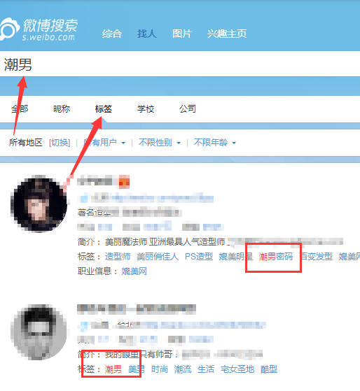 微博,微型博客,微博的月活跃用户量有4亿,在微博里面有大量的大V,这些大V都有自己的粉丝,每一个微博粉丝都会有自己擅长的方面。微博搜索找人,例如你做潮男的商品,那么我就去搜索潮男,下面选标签是潮男,如下图。找微博达人注重几点一个是粉丝量,和你要推广的标签是不是一样。像阿里V任务的那些达人,基本也有其他站外的自媒体,他们可能是微博达人也可能是其他自媒体的达人,这样子我们可以和这些淘宝达人进行站外的合作。合作的目的想必大家很清楚,就是为了让商品和活动页面有更多的曝光量,在他产生兴趣的时候会关注店铺,加购店铺宝贝以及领取双十一优惠券。