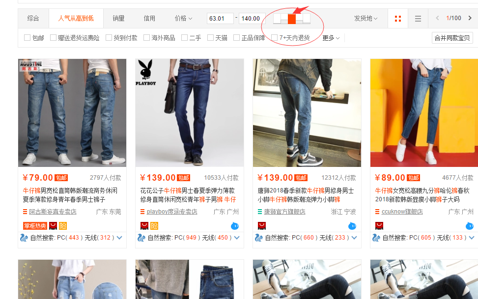 作为一个卖家,我们既要保证自己能够盈利,又要保证价格对顾客来说具有吸引力,那么我们该如何定制新上架宝贝的价格呢?首先我们要做好价格布局,我们要了解市场,了解消费者的心理,那么什么样的价格才是受市场和消费者欢迎的呢?我们要学会在淘宝上面去发现秘密,这里我们拿牛仔裤举例。首先我们打开淘宝页面搜索牛仔裤,并且按着人气从高到低排序