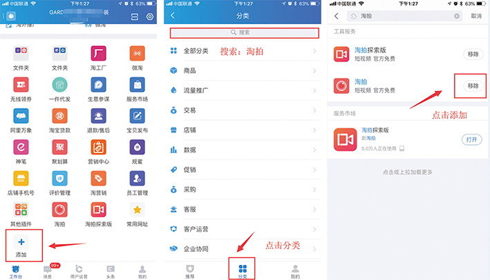 首先我们来看下淘拍的入口,打开手机千牛 – 下拉找到添加 – 点击分类 - 搜索:淘拍,然后添加,如图2: