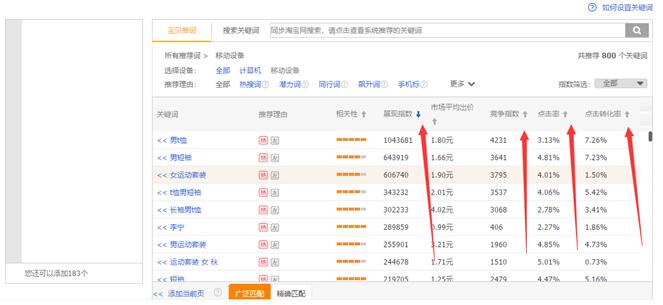 首先点击直通车里面的添加关键词,会出现上面的图片,这个时候我们需要点击展现指数,让推荐的关键词展现指数由高到低展示,这是为了方便我们选择关键词,因为不同情况下的直通车对关键词展现指数的选择标准是不同的,在直通车初期就要选择1万左右的词,而在直通车带动自然搜索的时候,预算充足和选择的关键词精准的情况下,展现指数肯定是越高越好。这里插一句话,质量分是直通车的核心,我这里有一个直通车三天十分的技巧,需要的可以加我旺旺,北蔡说,回复,质量分,送你。所以这样排序更方便我们选定展现指数区间,找好自己的区间之后剩下的选词标准就是先判断这个词是不是适合我们,然后再看点击率和转化率怎么样,在直通车涨分期更多的是看点击率,而直通车带动自然搜索的时候再看点击率的同时看一下转化率了,具体的标准一般点击率超过3都是可以的,而转化率超过1就可以了。最后才是看相关性,满格的直接用就可以了,不满格的可以记录一下然后在创意标题里面加上。
